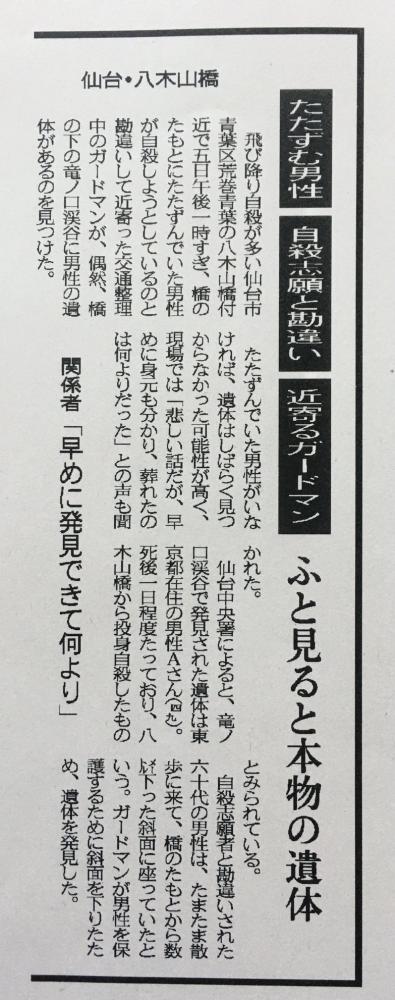 自殺防止フェンスが出来た初日に、やはりタクシーで乗り付けて、フェンスをよじ登って自殺した人がいて、地元の新聞「河北新報」に載ってたのを読んだ。