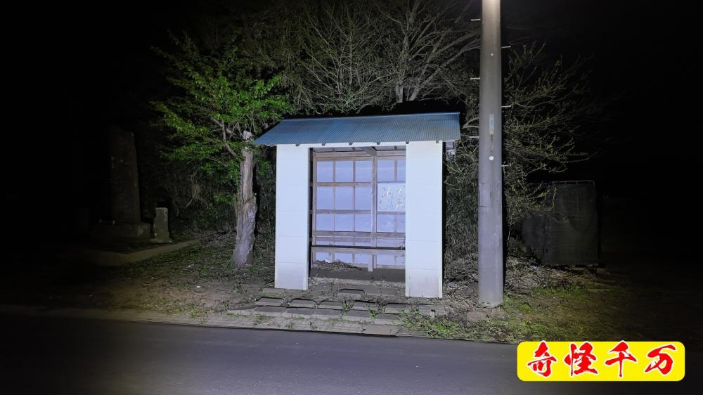 小さな小屋があるタイプのバス停。このバス停では午後11時11分になると何か装飾された箱を抱えた古い服装の女性の幽霊が立っていることがあるという。この付近で事故があったわけでもなければ、事件があったという記録もない。一つ考えられるとすればバス停の隣の招魂碑だが、招魂碑というのは終戦後どんな場所にでも盛んに建てられるものだ、ここだけ何かあったというのも考えにくい。だとするとこの女性はなぜここに、そして午後11時11分という限定的なタイミングで現れるのだろうか?