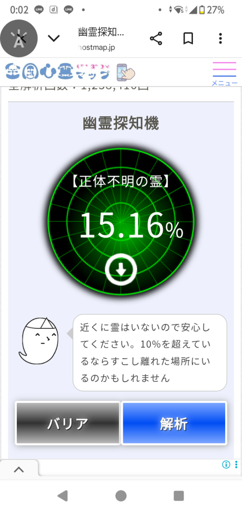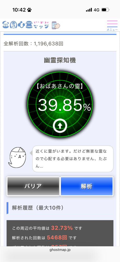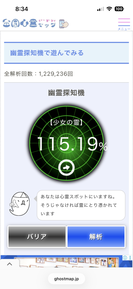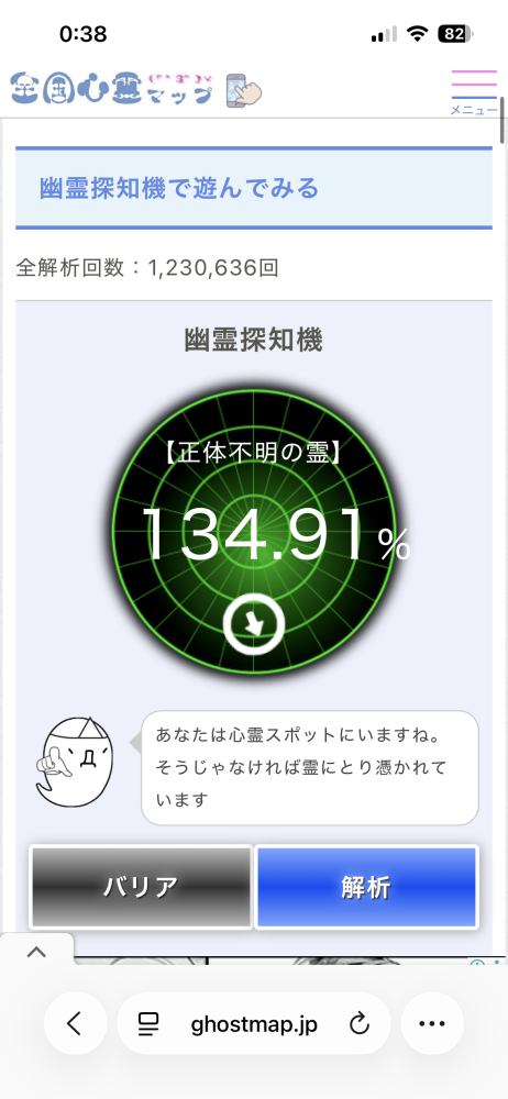 この近くに幽霊がいる可能性は「82.05%」です。https://ghostmap.jp/spotradar.php