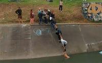 水路に落ちた犬を救うため、手と手を取り合って作られた「人間の鎖」